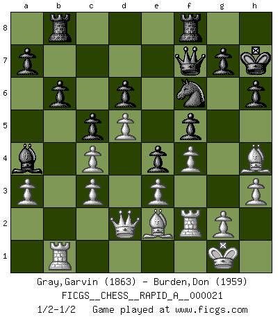 Last move : 1/2-1/2 2007 August 29 1:54:32 [Event "FICGS__CHESS__RAPID_A__000021"] [Site "FICGS"] [Date "2007.05.31"] [Round "1"] [White "Gray,Garvin"] [Black "Burden,Don"] [Result "1/2-1/2"] [WhiteElo "1863"] [BlackElo "1959"] 1.d4 Nf6 2.c4 e6 3.Nc3 Bb4 4.Nf3 c5 5.a3 Bxc3+ 6.bxc3 O-O 7.e3 d6 8.Bd3 Nc6 9.Qc2 e5 10.d5 Ne7 11.Ng5 h6 12.Nh7 Nxh7 13.Bxh7+ Kh8 14.Bd3 f5 15.f4 e4 16.Be2 Bd7 17.O-O Ng8 18.Rb1 Rb8 19.Bd2 Nf6 20.Be1 Qa5 21.Bh4 Ba4 22.Qd2 Kh7 23.Rb2 Qc7 24.h3 Qf7 25.R2b1 b6 26.Rf2 1/2-1/2 Nimzo-Indian : Three knights variation Kingside Castling by player Black (move 6) Kingside Castling by player White (move 17) This chess game ended in a draw. Follow this game move after move (download)I'd rather have a Pawn than a finger. (Reuben Fine) Ich habe die besten Aussichten, den ersten Preis zu gewinnen - denn jeder muss gegen Steinitz spielen, nur ich nicht! (Wilhelm Steinitz) El estómago es una parte esencial del maestro de Ajedrez. (Bent Larsen) Les échecs sont utiles à l'exercice de la faculté de penser et à celle de l'imagination. Car nous devons posséder une méthode élaborée pour atteindre des buts partout où nous devons conduire notre raison. (Leibnitz) A generalist learns less and less about more and more until he knows nothing about everything. (Author unknown)
