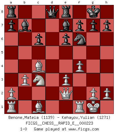 Last move : 1-0 2019 March 4 10:13:58 [Event "FICGS__CHESS__RAPID_E__000223"] [Site "FICGS"] [Date "2019.01.14"] [Round "1"] [White "Benone,Mateia"] [Black "Kehayov,Yulian"] [Result "1-0"] [WhiteElo "1139"] [BlackElo "1271"] 1.f4 d5 2.Nf3 Nf6 3.e3 e6 4.d4 Be7 5.Bd3 O-O 6.O-O c5 7.c4 cxd4 8.Nxd4 Nc6 9.Nxc6 bxc6 10.Nc3 Bb7 11.Qe2 dxc4 12.Bxc4 Re8 13.b3 1-0 This chess game has been lost on time (started : 2019.01.14 23:33:57) Bird's Opening Kingside Castling by player Black (move 5) Kingside Castling by player White (move 6) Player White won this chess game. Follow this game move after move (download)A strong memory, concentration, imagination, and a strong will is required to become a great Chess player. (Bobby Fischer) Den Ruhm habe ich schon, jetzt brauche ich noch das Geld. (Wilhelm Steinitz) Fischer era un maestro de claridad y un Rey del posicionamiento astuto. Sus oponentes podían ver hacia donde se dirigía pero eran impotentes para detenerlo. (Bruce Pandolfini) Le thème de l'attaque double intervient d'une manière ou d'une autre dans l'immense majorité des combinaisons. (Youri Averbakh) An expert is a man who has made all the mistakes which can be made in a very narrow field. (Niels Bohr)