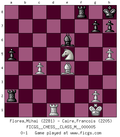 Last move : 0-1 2006 December 25 8:45:29 [Event "FICGS__CHESS__CLASS_M__000005"] [Site "FICGS"] [Date "2006.06.13"] [Round "1"] [White "Florea,Mihai"] [Black "Caire,Francois"] [Result "0-1"] [WhiteElo "2281"] [BlackElo "2205"] 1.e4 c5 2.Nf3 Nc6 3.d4 cxd4 4.Nxd4 Nf6 5.Nc3 e5 6.Ndb5 d6 7.Bg5 a6 8.Na3 b5 9.Nd5 Be7 10.Bxf6 Bxf6 11.c3 O-O 12.Nc2 Rb8 13.h4 Be7 14.Nce3 Be6 15.Qf3 Qd7 16.Rd1 Bd8 17.Bd3 Ne7 18.Bc2 b4 19.Nxb4 a5 20.Nd3 Qc6 21.Bb1 f5 22.exf5 e4 23.Qg4 Nxf5 24.Nf4 Rxb2 25.O-O Bc8 26.Nxf5 Bxf5 27.Qg3 d5 28.h5 Bc8 29.c4 Bc7 30.Nxd5 Bxg3 31.Ne7+ Kh8 32.Nxc6 Bxf2+ 33.Rxf2 Rbxf2 34.Bxe4 Rxa2 35.Ne5 Be6 0-1 Sicilian : Pelikan (Lasker/Sveshnikov) variation Kingside Castling by player Black (move 11) Kingside Castling by player White (move 25) Player Black won this chess game. Follow this game move after move (download)The combination player thinks forward; he starts from the given position, and tries the forceful moves in his mind. (Emanuel Lasker) Wenn du gegen Bobby spielst, ist es keine Frage von gewinnen oder verlieren. Es ist eine Frage des Überlebens. (Boris Vassilievich Spassky) Un mal plan es mejor que no tener ningún plan. (Frank Marshall) L'attaque fait le spectacle, la défense gagne les matchs. (Dicton footballistique) It is not true that people stop pursuing dreams because they grow old, they grow old because they stop pursuing dreams. (Gabriel Garcia Marquez)