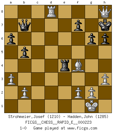 Last move : 1-0 2019 April 11 10:0:51 [Event "FICGS__CHESS__RAPID_E__000223"] [Site "FICGS"] [Date "2019.01.14"] [Round "1"] [White "Strohmeier,Josef"] [Black "Hadden,John"] [Result "1-0"] [WhiteElo "1210"] [BlackElo "1285"] 1.e4 e5 2.Nf3 Nc6 3.Bb5 a6 4.Ba4 b5 5.Bb3 h6 6.c3 d6 7.h3 Be6 8.O-O Nf6 9.Re1 Bxb3 10.Qxb3 Be7 11.d4 exd4 12.cxd4 O-O 13.a3 Rc8 14.Nc3 Na5 15.Qc2 c5 16.Bf4 cxd4 17.Nxd4 Nc4 18.Qe2 Qd7 19.Red1 Rfd8 20.Nf5 Re8 21.Rd3 Rc5 22.Rad1 Bd8 23.Nxd6 Nxd6 24.Rxd6 Qb7 25.Rxd8 Rxd8 26.Rxd8+ Kh7 27.e5 Nd7 28.Qd3+ g6 29.Ne4 Nxe5 30.Qd4 Rc4 31.Qxe5 Rxe4 32.Qh8+ 1-0 Ruy Lopez : Caro variation Kingside Castling by player White (move 8) Kingside Castling by player Black (move 12) Player White won this chess game. Follow this game move after move (download)If you aren't afraid of Spassky, then I have removed the element of money. (Jim Slater) Im Schach nämlich geht es darum, daß Ich des Gegners klein zu kriegen, sein Ego zu zerbrechen und zu zermahlen, seine Selbstachtung zu zertreten und zu verscharren und seine ganze mißachtenswerte sogenannte Persönlichkeit ein für alle Mal tot zu hacken und zu zerstampfen und dadurch die menschliche Gesellschaft von einer stinkenden Pestbeule zu befreien. Es ist ein königliches Spiel. (Robert James Fischer) Ayuda a tus piezas para que ellas te puedan ayudar. (Paul Morphy) La vérité est comme le meilleur coup aux échecs : elle existe, mais il faut la chercher. (Arturo Perez-Reverte) Strategy without tactics is the slowest route to victory. Tactics without strategy is the noise before defeat. (Sun Tzu)