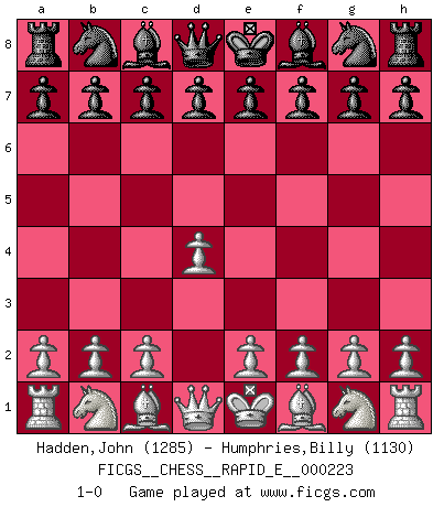 Last move : 1-0 2019 February 14 20:31:10 [Event "FICGS__CHESS__RAPID_E__000223"] [Site "FICGS"] [Date "2019.01.14"] [Round "1"] [White "Hadden,John"] [Black "Humphries,Billy"] [Result "1-0"] [WhiteElo "1285"] [BlackElo "1130"] 1.d4 1-0 This chess game has been lost on time (started : 2019.01.14 23:33:57) Queen's pawn Player White won this chess game. Follow this game move after move (download)I have never in my life played the French Defence, which is the dullest of all openings. (Wilhelm Steinitz) Gott hat gewollt, dass ich Champion werde. (Surab Azmajparaschvili) Una buena ofensiva y una buena defensa, comienzan ambas con un buen desarrollo. (Bruce A. Moon) J'ai vu le vaincu d'Echecs jouer des années durant dans l'espoir de la fête de la victoire. Car tu es plus riche de ce qu'elle existe si même elle n'est point pour toi. Ainsi de la perle du fond des mers. (Antoine de Saint-Exupéry) Creativity involves breaking out of established patterns in order to look at things in a different way. (Edward De Bono)