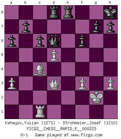 Last move : 0-1 2019 May 2 7:12:52 [Event "FICGS__CHESS__RAPID_E__000223"] [Site "FICGS"] [Date "2019.01.14"] [Round "1"] [White "Kehayov,Yulian"] [Black "Strohmeier,Josef"] [Result "0-1"] [WhiteElo "1271"] [BlackElo "1210"] 1.b4 d5 2.Bb2 Nf6 3.e4 Nxe4 4.Nc3 Nxc3 5.Bxc3 a6 6.Nf3 Bg4 7.Be2 Nc6 8.O-O e6 9.h3 Bxf3 10.Bxf3 Nxb4 11.a3 Nc6 12.Bb2 e5 13.Re1 f6 14.d4 e4 15.Be2 Bd6 16.c4 Ne7 17.cxd5 Nxd5 18.f3 Bg3 19.Rf1 Ne3 20.Qc1 Nxf1 21.Bxf1 exf3 22.gxf3 O-O 23.Kg2 Bh4 24.Qf4 Bg5 25.Qe4 c6 26.Bc4+ Kh8 27.Bc1 Bxc1 28.Rxc1 Re8 29.Qd3 Qd6 30.d5 Rad8 0-1 This chess game has been lost on time (started : 2019.01.14 23:33:57) Polish (Sokolsky) opening Kingside Castling by player White (move 8) Kingside Castling by player Black (move 22) Player Black won this chess game. Follow this game move after move (download)First-class players lose to second-class players because second-class players sometimes play a first-class game. (Siegbert Tarrasch) Schach ist Kampf, hauptsächlich jedoch gegen die eigenen Fehler. (Savielly Grigorievitsch Tartakower) Es el objetivo de la escuela moderna no tratar cada posición de acuerdo a una regla general, sino de acuerdo al principio inherente en la posición. (Richard Reti) Soyez une menace à chaque fois que vous vous asseyez pour jouer. (Ken Smith) The leaves of memory seemed to make a mournful rustling in the dark. (Henry Wadsworth Longfellow)
