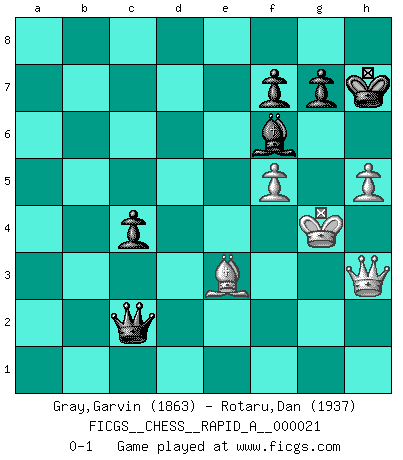 Last move : 0-1 2007 August 29 15:21:27 [Event "FICGS__CHESS__RAPID_A__000021"] [Site "FICGS"] [Date "2007.05.31"] [Round "1"] [White "Gray,Garvin"] [Black "Rotaru,Dan"] [Result "0-1"] [WhiteElo "1863"] [BlackElo "1937"] 1.e4 c5 2.Nf3 d6 3.d4 cxd4 4.Nxd4 Nf6 5.Nc3 a6 6.Bg5 e6 7.f4 Qb6 8.Qd2 Qxb2 9.Rb1 Qa3 10.Be2 Be7 11.O-O Nc6 12.Nxc6 bxc6 13.Rb3 Qa5 14.Rd1 Ra7 15.Bh4 O-O 16.Kf1 Kh8 17.Qe3 c5 18.Bf2 d5 19.exd5 Nxd5 20.Nxd5 exd5 21.Rxd5 Qxa2 22.f5 Qa1+ 23.Rd1 Qf6 24.g4 a5 25.Bg3 a4 26.Rbd3 Ba6 27.Rd7 Rxd7 28.Rxd7 Bd8 29.Bd6 Bxe2+ 30.Kxe2 Rg8 31.Qe5 Qh4 32.Qe4 h5 33.Ra7 Bf6 34.Bg3 Qg5 35.Rxa4 Qc1 36.gxh5 Rd8 37.Kf3 Qh1+ 38.Kg4 Qd1+ 39.Qf3 Qxc2 40.Ra8 Rxa8 41.Qxa8+ Kh7 42.Qd5 Qe2+ 43.Qf3 Qc4+ 44.Kh3 Qc2 45.Qf2 Qc3 46.Kg4 Qc4+ 47.Qf4 Qc2 48.Qf2 Qa4+ 49.Qf4 c4 50.Bf2 Qd1+ 51.Qf3 Qd2 52.Be3 Qxh2 53.Qh3 Qc2 0-1 Sicilian : Najdorf, 7...Qb6 Kingside Castling by player White (move 11) Kingside Castling by player Black (move 15) Player Black won this chess game. Follow this game move after move (download)Alekhine is a poet who creates a work of art out of something that would hardly inspire another man to send home a picture post card. (Max Euwe) Rauchen ist dem Schachspieler bei seiner Arbeit, also im Wettkampf, untersagt. (Viktor Kortschnoi) El Ajedrez lo es todo: arte, ciencia y deporte. (Anatoly Karpov) La tactique est l'élément le plus important du milieu de jeu. (Siegbert Tarrasch) Only sick music makes money today. (Friedrich Nietzsche)