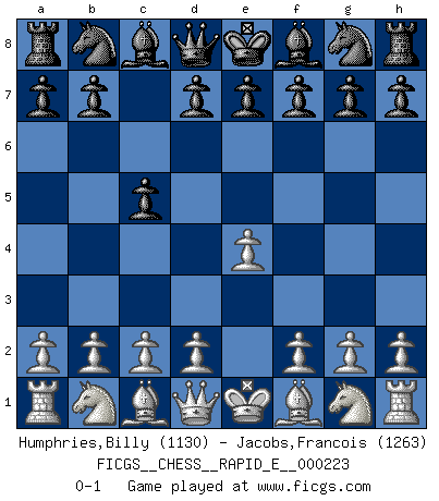 Last move : 0-1 2019 February 20 20:57:9 [Event "FICGS__CHESS__RAPID_E__000223"] [Site "FICGS"] [Date "2019.01.14"] [Round "1"] [White "Humphries,Billy"] [Black "Jacobs,Francois"] [Result "0-1"] [WhiteElo "1130"] [BlackElo "1263"] 1.e4 c5 0-1 This chess game has been lost on time (started : 2019.01.14 23:33:57) Sicilian defense Player Black won this chess game. Follow this game move after move (download)The essence of Chess is thinking about what Chess is. (David Bronstein) Besser ein falscher Plan, logisch durchgeführt, als gar kein Plan. (Viktor Kortschnoi) Botvinnik trató de alejar el misterio referente al Ajedrez, siempre relacionandolo a situaciones de la vida diaria. Solía llamar al Ajedrez un problema inexacto típico, similar a aquellos en que la gente tiene siempre que resolver a cada día. (Garry Kasparov) Une platitude souvent récitée à propos des Echecs est qu'une des choses les plus difficiles à réaliser est de gagner une position gagnante. Cela ne manque pas de sens mais, pour ma part, j'ai toujours trouvé plus difficile de gagner une position perdante. (Tim Krabbe) For a mechanic, you seem to do an excessive amount of thinking. (C-3PO in Star Wars ep.2)