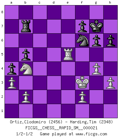 Last move : 1/2-1/2 2019 January 28 15:54:28 [Event "FICGS__CHESS__RAPID_SM__000021"] [Site "FICGS"] [Date "2019.01.15"] [Round "1"] [White "Ortiz,Clodomiro"] [Black "Harding,Tim"] [Result "1/2-1/2"] [WhiteElo "2456"] [BlackElo "2348"] 1.Nf3 d5 2.d4 Nf6 3.c4 e6 4.Nc3 c6 5.e3 Nbd7 6.Qc2 Bd6 7.Bd3 O-O 8.O-O dxc4 9.Bxc4 b5 10.Be2 Bb7 11.Rd1 Qc7 12.e4 e5 13.dxe5 Nxe5 14.Nd4 Bc5 15.Bf4 Bxd4 16.Rxd4 Nf3+ 17.Bxf3 Qxf4 18.Rc1 Qe5 19.Ne2 Rfe8 20.g3 g6 21.Bg2 c5 22.Qxc5 Bxe4 23.Qxe5 Rxe5 24.Nf4 Bxg2 25.Kxg2 a5 26.a3 Kg7 27.Nd3 R5e8 28.Rc7 Rec8 29.Rb7 Rab8 30.Ra7 Ra8 31.Rxa8 Rxa8 32.Rd6 Rb8 33.h3 a4 34.g4 h6 35.Kf3 Rb7 36.Nb4 Ne8 37.Rd5 Nf6 38.Re5 1/2-1/2 Reti Opening Kingside Castling by player Black (move 7) Kingside Castling by player White (move 8) This chess game ended in a draw. Follow this game move after move (download)You know, comrade Pachman, I don't enjoy being a Minister, I would rather play Chess like you. (Che Guevara) Ein typischer, sehr verbreiteter Gedankenschädling ist der, daß der betreffende Amateur von der Annanhme ausgeht, daß jeder einzelne Zug etwas zu leisten habe. (Aaron Nimzowitsch) Cuando me preguntan: -¿Cual es el secreto que te hace hacer mejores movidas que tus oponentes?, Yo respondo: Me da gusto que me pregunten eso, porque, como veran, hay una simple razón. Yo pienso mis propias movidas y dejo a mi oponente que el piense las suyas. (Alexander Alekhine) La solitude du joueur d'Echecs à l'approche du mat est semblable à celle du condamné. (Francis Szpiner) If you lose the game you should win the analysis! (Proverb)
