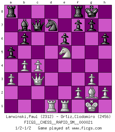 Last move : 1/2-1/2 2019 January 23 16:4:32 [Event "FICGS__CHESS__RAPID_SM__000021"] [Site "FICGS"] [Date "2019.01.15"] [Round "1"] [White "Larwinski,Paul"] [Black "Ortiz,Clodomiro"] [Result "1/2-1/2"] [WhiteElo "2312"] [BlackElo "2456"] 1.d4 Nf6 2.c4 e6 3.Nf3 b6 4.g3 Ba6 5.b3 Bb4+ 6.Bd2 Be7 7.Bg2 c6 8.Bc3 d5 9.Nbd2 Nbd7 10.O-O O-O 11.Re1 Bb7 12.e4 dxe4 13.Nxe4 c5 14.Nxf6+ Bxf6 15.Qd2 Qc7 16.dxc5 Bxc3 17.Qxc3 Nxc5 18.Rad1 a5 19.a3 h6 20.b4 Nd7 21.Ne5 1/2-1/2 Queen's Indian : Nimzovich variation (exaggerated Fianchetto) Kingside Castling by player White (move 10) Kingside Castling by player Black (move 10) This chess game ended in a draw. Follow this game move after move (download)If a ruler does not understand Chess, how can he rule over a kingdom ? (King Khusros II) Stelle das Brett so, daß die Sonne in die Augen deines Gegners scheint. (Ruy López) En la perfecta combinación de Ajedrez como en una historia corta de primera clase, toda la trama y contra trama deberá conducir hacia un final sorprendente, el interes no es mitigado hasta el último momento. (Yates and Winter) Le temps de noter son nom sur la feuille de partie, j'étais déjà en zeitnot ! D'un modeste amateur apparié lors de la première ronde d'un open contre le grand-maître Azmaïparashvili. A computer lets you make more mistakes faster than any invention in human history - with the possible exceptions of handguns and tequila. (Mitch Ratcliffe)