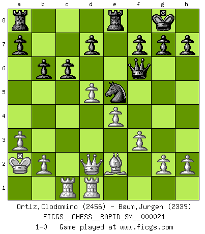 Last move : 1-0 2019 March 7 22:30:49 [Event "FICGS__CHESS__RAPID_SM__000021"] [Site "FICGS"] [Date "2019.01.15"] [Round "1"] [White "Ortiz,Clodomiro"] [Black "Baum,Jurgen"] [Result "1-0"] [WhiteElo "2456"] [BlackElo "2339"] 1.d4 Nf6 2.c4 e6 3.Nc3 Bb4 4.e3 b6 5.Nge2 Bb7 6.a3 Bd6 7.f3 Nh5 8.e4 Qh4+ 9.Kd2 Ng3 10.Nxg3 Bxg3 11.Kc2 Nc6 12.Kb1 Bf4 13.d5 Ne5 14.Bxf4 Qxf4 15.Be2 Qf6 16.Ka2 O-O 17.Qd2 exd5 18.Nxd5 Bxd5 19.cxd5 Rfe8 20.Rac1 c6 21.Rhd1 1-0 This chess game has been lost on time (started : 2019.01.15 6:45:25) Nimzo-Indian : Fischer variation Kingside Castling by player Black (move 16) Player White won this chess game. Follow this game move after move (download)Castle early and often. (Rob Sillars) Frage: Wie viele Autos haben Sie schon zerstört? - Antwort: Nur zwei. (Loek van Wely) Las leyes del Ajedrez no permiten una libre elección: tienes que mover quieras o no. (Emanuel Lasker) Les Echecs sont et restent toujours un combat, un combat intégral comme la boxe, la lutte ou un autre sport, et où il doit y avoir un vainqueur et un vaincu. (Joseph Emil Diemer) To steal ideas from one person is plagiarism. To steal from many is research. (Unknown)