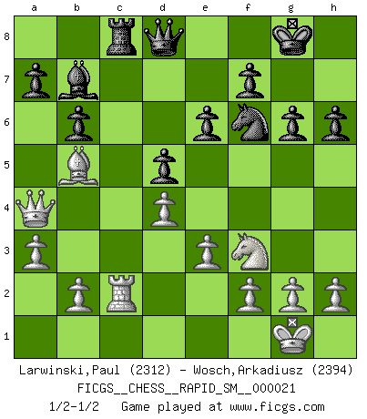 Last move : 1/2-1/2 2019 March 2 19:17:52 [Event "FICGS__CHESS__RAPID_SM__000021"] [Site "FICGS"] [Date "2019.01.15"] [Round "1"] [White "Larwinski,Paul"] [Black "Wosch,Arkadiusz"] [Result "1/2-1/2"] [WhiteElo "2312"] [BlackElo "2394"] 1.d4 Nf6 2.c4 e6 3.Nf3 d5 4.Bg5 Be7 5.e3 O-O 6.Nc3 Nbd7 7.Qc2 c6 8.a3 h6 9.Bh4 b6 10.cxd5 cxd5 11.Bd3 Bb7 12.O-O Rc8 13.Nd2 Ne8 14.Bxe7 Qxe7 15.Qb3 Nd6 16.Rac1 g6 17.Rc2 Rc7 18.Rfc1 Rfc8 19.Nf3 Qd8 20.Nb5 Rxc2 21.Rxc2 Nxb5 22.Bxb5 Nf6 23.Qa4 1/2-1/2 Queen's pawn game Kingside Castling by player Black (move 5) Kingside Castling by player White (move 12) This chess game ended in a draw. Follow this game move after move (download)When I asked Fischer why he had not played a certain move in our game, he replied: 'Well, you laughed when I wrote it down !' (Mikhail Tal) Ich rechne überhaupt nicht voraus. Ich gewinne auch so. (Robert James Fischer) No es tiempo de jugar al Ajedrez cuando la casa esta en llamas. (Proverbio Italiano) J'ai vu le vaincu d'Echecs jouer des années durant dans l'espoir de la fête de la victoire. Car tu es plus riche de ce qu'elle existe si même elle n'est point pour toi. Ainsi de la perle du fond des mers. (Antoine de Saint-Exupéry) The absolute truth is the thing that makes people laugh. (Carl Reiner)