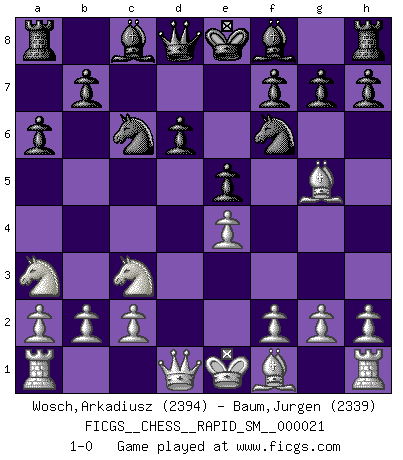 Last move : 1-0 2019 February 24 9:16:31 [Event "FICGS__CHESS__RAPID_SM__000021"] [Site "FICGS"] [Date "2019.01.15"] [Round "1"] [White "Wosch,Arkadiusz"] [Black "Baum,Jurgen"] [Result "1-0"] [WhiteElo "2394"] [BlackElo "2339"] 1.e4 c5 2.Nf3 Nc6 3.d4 cxd4 4.Nxd4 Nf6 5.Nc3 e5 6.Ndb5 d6 7.Bg5 a6 8.Na3 1-0 This chess game has been lost on time (started : 2019.01.15 6:45:25) Sicilian : Pelikan (Lasker/Sveshnikov) variation Player White won this chess game. Follow this game move after move (download)What would Chess be without silly mistakes ? (Kurt Richter) Alle offensichtlichen Züge sehen nach dem Spiel in der Analyse verdächtig aus. (Viktor Kortschnoi) En posiciones complicadas, Bobby Fischer pocas veces tuvo que temer de cualquiera. (Paul Keres) A ce moment-là, je menaçais de comprendre la position ! (Clément L'Heureux) Knowledge will give you power, but character respect. (Bruce Lee)