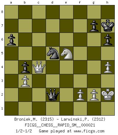 Last move : 1/2-1/2 2019 March 19 17:16:4 [Event "FICGS__CHESS__RAPID_SM__000021"] [Site "FICGS"] [Date "2019.01.15"] [Round "1"] [White "Broniek,Mariusz Maciej"] [Black "Larwinski,Paul"] [Result "1/2-1/2"] [WhiteElo "2315"] [BlackElo "2312"] 1.e4 e5 2.Nf3 Nc6 3.Bb5 a6 4.Ba4 Nf6 5.O-O Nxe4 6.d4 b5 7.Bb3 d5 8.dxe5 Be6 9.Qe2 Nc5 10.Rd1 Nxb3 11.axb3 Be7 12.c4 b4 13.Bg5 Bxg5 14.cxd5 Bxd5 15.Nxg5 Qxg5 16.Rxd5 O-O 17.Nd2 Rad8 18.Nf3 Qf5 19.Qc4 Rxd5 20.Qxd5 Qc2 21.e6 fxe6 22.Qxe6+ Kh8 23.Qe3 Qxb2 24.Rc1 Ne7 25.h4 h6 26.Rxc7 Nd5 27.Qc5 Rd8 28.Rc8 Qb1+ 29.Kh2 Rxc8 30.Qxc8+ Kh7 31.Qc4 Qd1 32.Ne5 Qd2 1/2-1/2 Ruy Lopez : Open, 7.Bb3 Kingside Castling by player White (move 5) Kingside Castling by player Black (move 16) This chess game ended in a draw. Follow this game move after move (download)When you don't know what to play, wait for an idea to come into your opponent's mind. You may be sure that idea will be wrong. (Siegbert Tarrasch) Fischer: 'Remis!?' Uhlmann: 'Aber es muss doch dreimal Zugwiederholung sein!' Fischer: 'Sie nehmen das Remis an, wie ich es sage, sonst spiele ich weiter und werde Sie dann schlagen!' (Robert James Fischer) Jugadores de primera clase pierden en contra de jugadores de segunda clase porque los jugadores de segunda clase a veces juegan una partida de primer clase. (Siegbert Tarrasch) Avant la finale, les dieux ont créé le milieu de partie. (Tarrasch) A good book on your shelf is a friend that turns its back on you and remains a friend. (Author unknown)