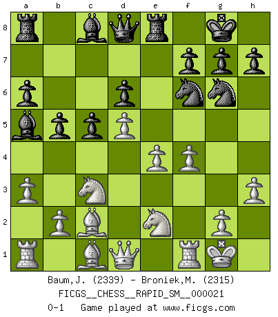 Last move : 0-1 2019 March 11 10:34:49 [Event "FICGS__CHESS__RAPID_SM__000021"] [Site "FICGS"] [Date "2019.01.15"] [Round "1"] [White "Baum,Jurgen"] [Black "Broniek,Mariusz Maciej"] [Result "0-1"] [WhiteElo "2339"] [BlackElo "2315"] 1.d4 Nf6 2.c4 e6 3.Nc3 Bb4 4.f3 c5 5.d5 O-O 6.e4 d6 7.Bd3 exd5 8.cxd5 a6 9.Nge2 Nbd7 10.O-O Ne5 11.Bc2 b5 12.f4 Ng6 13.h3 Re8 14.a3 Ba5 0-1 This chess game has been lost on time (started : 2019.01.15 6:45:25) Nimzo-Indian : Kmoch variation Kingside Castling by player Black (move 5) Kingside Castling by player White (move 10) Player Black won this chess game. Follow this game move after move (download)Alekhine is a poet who creates a work of art out of something that would hardly inspire another man to send home a picture post card. (Max Euwe) Auf jeden Fall musst du zuerst Rechtsanwalt werden, damit du deine eigenen Interessen und die deiner Familie vertreten kannst. [Brief an seinen Sohn] (José Raúl Capablanca) Fischer es el jugador mas fuerte del mundo. De hecho, el jugador mas fuerte que jamas haya existido. (Larry Evans) La tactique est l'élément le plus important du milieu de jeu. (Siegbert Tarrasch) Control your own destiny or someone else will. (Jack Welch)