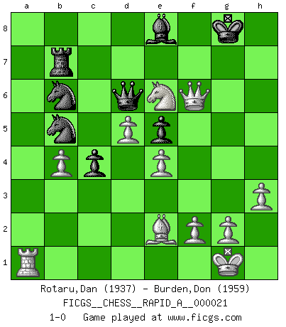 Last move : 1-0 2007 July 1 16:31:46 [Event "FICGS__CHESS__RAPID_A__000021"] [Site "FICGS"] [Date "2007.05.31"] [Round "1"] [White "Rotaru,Dan"] [Black "Burden,Don"] [Result "1-0"] [WhiteElo "1937"] [BlackElo "1959"] 1.e4 c5 2.Nf3 d6 3.Bb5+ Nc6 4.O-O Bd7 5.Re1 Nf6 6.h3 a6 7.Bf1 e5 8.c3 Be7 9.d4 h6 10.d5 Na7 11.a4 b5 12.axb5 axb5 13.b4 Qb8 14.Re2 O-O 15.bxc5 dxc5 16.Qe1 Qc7 17.Rea2 Rfb8 18.Nbd2 c4 19.Ba3 Bxa3 20.Rxa3 Rb7 21.Qe3 Ne8 22.Be2 f6 23.Nf1 Qb8 24.Ng3 Nc7 25.Nh5 b4 26.cxb4 Nab5 27.Rxa8 Nxa8 28.Nxf6+ gxf6 29.Qxh6 Be8 30.Qxf6 Nb6 31.Ng5 Qd6 32.Ne6 1-0 Comment by player 1 : Dan Rotaru : Thanks for the game. Good luck with the other ones. Sicilian : Canal-Sokolsky (Nimzovich-Rossolimo, Moscow) attack Kingside Castling by player White (move 4) Kingside Castling by player Black (move 14) Player White won this chess game. Follow this game move after move (download)It is not enough to be a good player... you must also play well. (Siegbert Tarrasch) Modernes Schach sorgt sich zuviel um Dinge wie Bauernstruktur usw. Vergessen Sie das, Schachmatt beendet das Spiel! (Nigel Short) El Ajedrez es tan inspirador que yo no creo que un buen jugador sea capaz de tener un pensamiento malo durante una partida. (Wilhelm Steinitz) D'abord les bases : Jouez et étudiez, puis étudiez et jouez, ensuite jouez et étudiez, puis étudiez et jouez. Deuxièmement : Donnez toujours le meilleur de vous-même ! (Ken Smith) Computers are like Old Testament gods; lots of rules and no mercy. (Joseph Campbell)