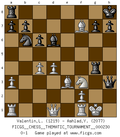 Last move : 0-1 2019 April 5 2:14:21 [Event "FICGS__CHESS__THEMATIC_TOURNAMENT__000230"] [Site "FICGS"] [Date "2019.01.19"] [Round "1"] [White "Valentin,Laurentiu"] [Black "Aahlad,Yeturu"] [Result "0-1"] [WhiteElo "1219"] [BlackElo "2077"] 1.e4 e5 2.Nf3 Nf6 3.Nxe5 d6 4.Nd3 Nxe4 5.Be2 d5 6.O-O Bd6 7.Ne1 O-O 8.d4 Bf5 9.Be3 Nd7 10.c4 dxc4 11.Bxc4 Nb6 12.Bb3 c6 13.Nc3 Re8 14.h3 Qd7 15.a3 Bxh3 16.gxh3 Qxh3 17.Nf3 Nxc3 18.bxc3 Re4 19.Bxf7+ Kh8 20.c4 Rg4+ 0-1 Petrov's defense Kingside Castling by player White (move 6) Kingside Castling by player Black (move 7) Player Black won this chess game. Follow this game move after move (download)Any material change in a position must come about by mate, a capture, or a Pawn promotion. (Purdy) Die Jungen erwarten, dass Opa einfach umfällt. Dann aber kann Opa fünf Stunden lang Schach spielen und die jungen Gegner an die Wand drücken. (Viktor Kortschnoi) Los libros de Ajedrez deben de usarse igual como usamos los anteojos: para mejorar la vista, aunque algunos jugadores los quieren usar como si ellos les otorgaran la vision. (José Raúl Capablanca) Dans le domaine de la peinture, de la gravure et de la sculpture, dès la première décennie de notre siècle, les artistes abandonnent la représentation de la partie d'échecs pour se concentrer sur les pièces, sur les échiquiers et sur toutes les variations auxquelles les unes et les autres peuvent donner lieu. On passe en quelque sorte d'un thème social à un thème musical (au sens de la musica médiévale, c'est-à-dire d'une notion qui inclue le rythme, l'harmonie, la construction et la déconstruction, etc.). Graphiquement et picturalement, l'échiquier apparaît comme une structure ouverte, dynamique, d'une richesse infinie, autorisant toutes les combinatoires et débouchant sur des mouvements et des rythmes de nature exponentielle. (Michel Pastoureau) The real danger is not that computers will begin to think like men, but that men will begin to think like computers. (Sydney J. Harris)