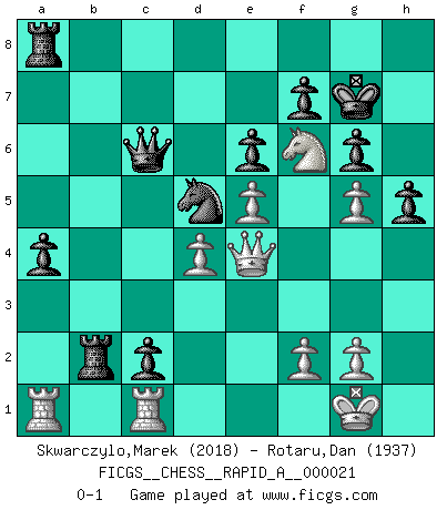 Last move : 0-1 2007 June 25 12:8:3 [Event "FICGS__CHESS__RAPID_A__000021"] [Site "FICGS"] [Date "2007.05.31"] [Round "1"] [White "Skwarczylo,Marek"] [Black "Rotaru,Dan"] [Result "0-1"] [WhiteElo "2018"] [BlackElo "1937"] 1.d4 Nf6 2.Nf3 d5 3.c4 c6 4.Nc3 dxc4 5.e4 b5 6.e5 Nd5 7.a4 e6 8.axb5 Nxc3 9.bxc3 cxb5 10.Ng5 Bb7 11.Qh5 g6 12.Qg4 Be7 13.Be2 Bd5 14.Bf3 Nc6 15.Ne4 h5 16.Qf4 a5 17.O-O Kf8 18.h4 Kg7 19.Be3 a4 20.Rfb1 b4 21.cxb4 Nxb4 22.Ng5 Qf8 23.Bxd5 Nxd5 24.Qf3 c3 25.Bc1 Qe8 26.Ne4 Qc6 27.Bg5 Bxg5 28.hxg5 c2 29.Rc1 Rhb8 30.Nf6 Rb3 31.Qe4 Rb2 0-1 Comment by player 2 : Dan Rotaru : Thanks for the game. Good game! Queen's pawn game Kingside Castling by player White (move 17) Player Black won this chess game. Follow this game move after move (download)A great player and a great example for many. His book My 60 Memorable Games had a big impact on me. It is a shame he didn't continue to enrich the world of chess with his unparalleled understanding after 1972. (Jan Timman, about Bobby Fischer's death) Warum muß ich gegen diesen IDIOTEN verlieren? (Aaron Nimzowitsch) El tablero es el mundo, las piezas es el fenomeno del universo, las reglas del juego son lo que llamamos leyes de la naturaleza y el jugador del lado opuesto, se encuentra oculto a nuestra vista. (Thomas Huxley) Les échecs, c'est l'art d'analyser. (Mikhail Botvinnik) A shortcut is the longest distance between two points. (Don Groves)
