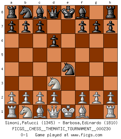 Last move : 0-1 2019 March 1 10:0:15 [Event "FICGS__CHESS__THEMATIC_TOURNAMENT__000230"] [Site "FICGS"] [Date "2019.01.19"] [Round "1"] [White "Simoni,Patucci"] [Black "Barbosa,Edinardo"] [Result "0-1"] [WhiteElo "1345"] [BlackElo "1810"] 1.e4 e5 2.Nf3 Nf6 3.Nxe5 d6 4.Nd3 Nxe4 0-1 This chess game has been lost on time (started : 2019.01.19 19:4:13) Petrov's defense Player Black won this chess game. Follow this game move after move (download)Chess is a sea in which a gnat may drink and an elephant may bathe. (Hindu proverb) Zeige mir drei Eröffnungsvarianten und ich beweise dir, dass zwei davon inkorrekt sind. (Emanuel Lasker) Uno por uno, yo los acribillé, mi superioridad muy pronto se volvio aparente. (Jose Capablanca) Mais l'homme est une créature légère et illogique : semblable au joueur d'échecs, il n'aime que le processus du but à atteindre, non le but lui-même. (Dostoïevsky) Nobody is always a winner, and anybody who says he is, is either a liar or doesn't play poker. (Amarillo Slim)