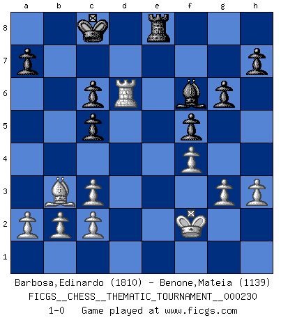 Last move : 1-0 2019 February 14 23:38:5 [Event "FICGS__CHESS__THEMATIC_TOURNAMENT__000230"] [Site "FICGS"] [Date "2019.01.19"] [Round "1"] [White "Barbosa,Edinardo"] [Black "Benone,Mateia"] [Result "1-0"] [WhiteElo "1810"] [BlackElo "1139"] 1.e4 e5 2.Nf3 Nf6 3.Nxe5 d6 4.Nd3 Nxe4 5.Qe2 Qe7 6.Nc3 Nxc3 7.dxc3 Nc6 8.Be3 Be6 9.Nf4 O-O-O 10.Nxe6 Qxe6 11.g3 Be7 12.Bg2 d5 13.O-O Rhe8 14.Qd3 f5 15.Rfe1 Qd7 16.Rad1 Ne5 17.Qxd5 Qxd5 18.Rxd5 Rxd5 19.Bxd5 Bf6 20.Rd1 c6 21.Bb3 b6 22.h3 g6 23.f4 Nd7 24.Kf2 Nc5 25.Bxc5 bxc5 26.Rd6 1-0 Petrov's defense Queenside Castling by player Black (move 9) Kingside Castling by player White (move 13) Player White won this chess game. Follow this game move after move (download)Chess makes man wiser and clear-sighted. (Vladimir Putin) Es ist peinlich, dass ich nie Weltmeister wurde. Es wäre leicht, Leonid Breschnjew als Ursache vorzuschieben, dessen Apparat den Vorzeigekommunisten Anatoli Karpow in allem unterstützte. Aber Garri Kasparow zum Beispiel, der ebenfalls von den Sowjets unerwünscht war, hat trotz der Widerstände den WM-Titel erobert. (Viktor Kortschnoi) Yo no le temo a Spassky. Todos saben que yo soy el mejor. Uno no necesita un torneo para probarlo. (Bobby Fischer) La victoire dans une partie d'Echecs appartient la plupart du temps à celui qui voit un peu plus loin que l'adversaire. (Lasker) Always two there are. No more no less. A master, and an apprentice. (Master Yoda in Star Wars ep.1)