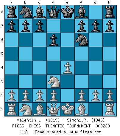 Last move : 1-0 2019 February 28 21:54:30 [Event "FICGS__CHESS__THEMATIC_TOURNAMENT__000230"] [Site "FICGS"] [Date "2019.01.19"] [Round "1"] [White "Valentin,Laurentiu"] [Black "Simoni,Patucci"] [Result "1-0"] [WhiteElo "1219"] [BlackElo "1345"] 1.e4 e5 2.Nf3 Nf6 3.Nxe5 d6 4.Nd3 1-0 This chess game has been lost on time (started : 2019.01.19 19:4:13) Petrov's defense Player White won this chess game. Follow this game move after move (download)When asked, -How is that you pick better moves than your opponents?, I responded: I'm very glad you asked me that, because, as it happens, there is a very simple answer. I think up my own moves, and I make my opponent think up his. (Alexander Alekhine) Modernes Schach sorgt sich zuviel um Dinge wie Bauernstruktur usw. Vergessen Sie das, Schachmatt beendet das Spiel! (Nigel Short) Los errores estan ahí, esperando a que se cometan. (Savielly Tartakower) Le jeu d'échecs est comme rejeté hors du temps. (Antoine de Saint-Exupéry) All war is based on deception. (Sun Tzu)