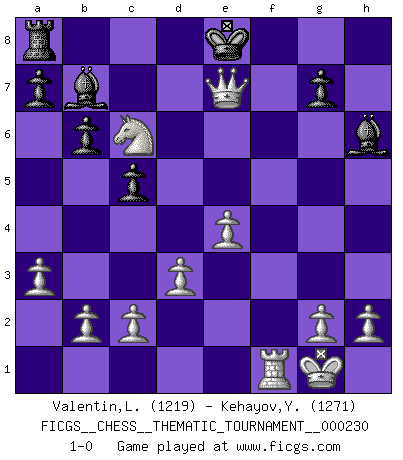 Last move : 1-0 2019 April 16 13:58:15 [Event "FICGS__CHESS__THEMATIC_TOURNAMENT__000230"] [Site "FICGS"] [Date "2019.01.19"] [Round "1"] [White "Valentin,Laurentiu"] [Black "Kehayov,Yulian"] [Result "1-0"] [WhiteElo "1219"] [BlackElo "1271"] 1.e4 e5 2.Nf3 Nf6 3.Nxe5 d6 4.Nd3 Nc6 5.Be2 Be7 6.Bf3 O-O 7.O-O Re8 8.Nc3 Nd4 9.Nf4 Nxf3+ 10.Qxf3 Bf8 11.d3 c5 12.Be3 b6 13.Rad1 Bb7 14.a3 h6 15.Ncd5 Nxd5 16.Nxd5 Re5 17.Qg3 Be7 18.Bxh6 Bg5 19.f4 Bxh6 20.fxe5 dxe5 21.Qxe5 Qd7 22.Ne7+ Kf8 23.Rxf7+ Kxf7 24.Rf1+ Ke8 25.Nc6 Qe7 26.Qxe7+ 1-0 Petrov's defense Kingside Castling by player Black (move 6) Kingside Castling by player White (move 7) Player White won this chess game. Follow this game move after move (download)The hardest game to win is a won game. (Emanuel Lasker) Schach ist ein Teil der Kultur, und wenn es mit der Kultur abwärts geht, geht es auch mit dem Schach abwärts. (Mikhail Moiseyevich Botvinik) Dejen al perfeccionista jugar por correo. (Yasser Seirawan) Vous m'avez demandé de vous exposer quel est le fondement de la prière. Je ne fais que préparer les pièces du jeu sur la table... Nous sera-t-il permis d'en adopter les règles et si nous les appliquons scrupuleusement nous ne tarderons pas à faire mat le Roi divin ! Il ne pourra échapper à nos mains. (Sainte Thérèse d'Avila, Chemin de perfection) He who laughs last probably does not get the joke. (Unknown)