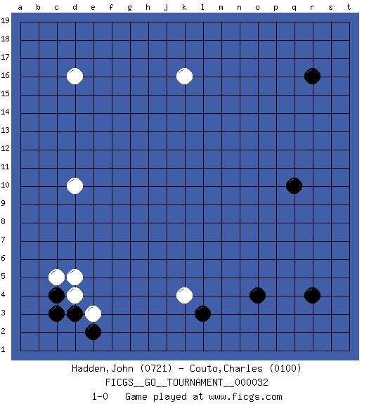 Last move : 1-0 2019 March 10 22:33:23 [Event "FICGS__GO__TOURNAMENT__000032"] [Site "FICGS"] [Date "2019.01.20"] [Round "1"] [Black "Hadden,John"] [White "Couto,Charles"] [Result "1-0"] [Rating 1 "0721"] [Rating 2 "0100"] 1.r4 d16 2.r16 d4 3.o4 k16 4.d3 d5 5.c4 c5 6.c3 d10 7.q10 k4 8.l3 e3 9.e2 1-0 This go game has been lost on time (started : 2019.01.20 2:31:44) Here are the names of the openings (joseki) played in the four corners : Corner d4 : d4 d3 Hoshi (Hwajeom, Seongjeom, Xingwei`) 4-4 Point. The star or hoshi (4-4) point, emphasizing influence at the potential expense of territory. Player Black won this Go (weiqi, baduk) game. Follow this game move after move (download)When your opponent is thick, you must also become thick. (Otake Hideo, 9p) You cannot beat a roulette table unless you steal money from it. (Albert Einstein)