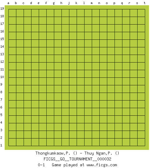 Last move : 0-1 2019 February 19 8:48:53 [Event "FICGS__GO__TOURNAMENT__000032"] [Site "FICGS"] [Date "2019.01.20"] [Round "1"] [Black "Thongkumkaow,Patthadol"] [White "Thuy Ngan,Pham"] [Result "0-1"] 0-1 This go game has been lost on time (started : 2019.01.20 2:31:44) Here are the names of the openings (joseki) played in the four corners : Player White won this Go (weiqi, baduk) game. Follow this game move after move (download)With only one group, you will win. (Anonymous) Children in the dark cause accidents, accidents in the dark cause children. (Unknown)