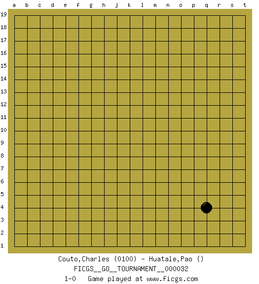 Last move : 1-0 2019 February 21 21:2:46 [Event "FICGS__GO__TOURNAMENT__000032"] [Site "FICGS"] [Date "2019.01.20"] [Round "1"] [Black "Couto,Charles"] [White "Huatale,Pao"] [Result "1-0"] [Rating 1 "0100"] 1.q4 1-0 This go game has been lost on time (started : 2019.01.20 2:31:44) Here are the names of the openings (joseki) played in the four corners : Corner q4 : q4 1-0 Hoshi (Hwajeom, Seongjeom, Xingwei`) 4-4 Point. The star or hoshi (4-4) point, emphasizing influence at the potential expense of territory. Player Black won this Go (weiqi, baduk) game. Follow this game move after move (download)Do not make moves that strengthen your opponent ! (Anonymous) Men should grow up. - Yeah. And dogs should stop licking themselves. It's not gonna happen. (Gregory House to Dr. Cameron, House M.D.)