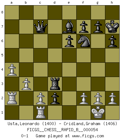 Last move : 0-1 2007 August 2 13:52:42 [Event "FICGS__CHESS__RAPID_B__000054"] [Site "FICGS"] [Date "2007.05.31"] [Round "1"] [White "Usta,Leonardo"] [Black "Cridland,Graham"] [Result "0-1"] [WhiteElo "1400"] [BlackElo "1406"] 1.e4 c5 2.Nf3 e6 3.d4 cxd4 4.Nxd4 Nc6 5.Nxc6 bxc6 6.Bc4 d5 7.exd5 cxd5 8.Bb5+ Bd7 9.a4 Nf6 10.Bg5 Be7 11.O-O O-O 12.Nc3 a6 13.Bxd7 Qxd7 14.Ne2 Rfc8 15.Nc3 Rab8 16.Ra2 h6 17.Bf4 Rb4 18.Bd2 Rbc4 19.Qe2 d4 20.b3 Rxc3 21.Bxc3 Rxc3 22.Qxa6 Qc7 23.Rc1 d3 24.Qa8+ Kh7 25.Qf3 d2 26.Qd3+ Rxd3 0-1 This chess game has been lost on time (started : 2007.05.31 12:43:26) Sicilian defense Kingside Castling by player White (move 11) Kingside Castling by player Black (move 11) Player Black won this chess game. Follow this game move after move (download)I had a toothache during the first game. In the second game I had a headache. In the third game it was an attack of rheumatism. In the fourth game, I wasn't feeling well. And in the fifth game? Well, must one have to win every game ? (Siegbert Tarrasch) Schach ist ein Kampf gegen den Fehler. (Johannes Herrman Zukertort) Un juego de Ajedrez es un dialogo, una conversación entre un jugador y su oponente. Cada movimiento del oponente puede contener amenazas o tropiezos, pero un jugador no se puede defender de las amenazas o tomar ventaja de los tropiezos si es que no se pregunta a sí mismo: ¿Que es lo que mi oponente va a hacer después de cada movida?. (Bruce A. Moon) Il n'y a plus de joueurs du niveau de Jacob Murray dont la seule quête est le beau jeu, le plaisir de voir les pièces construire quelque chose. Sur 10 idées à la minute, 9 seront sans intérêt, la dernière s'avèrera géniale. (Christian Bauer) Never risk one's whole fortune unless supported by one's entire army. (Niccolo Machiavelli)