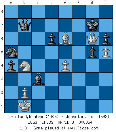 Last move : 1-0 2007 August 24 0:56:14 [Event "FICGS__CHESS__RAPID_B__000054"] [Site "FICGS"] [Date "2007.05.31"] [Round "1"] [White "Cridland,Graham"] [Black "Johnston,Jim"] [Result "1-0"] [WhiteElo "1406"] [BlackElo "1592"] 1.e4 c5 2.Nf3 d6 3.d4 cxd4 4.Nxd4 Nf6 5.Nc3 a6 6.Bg5 e6 7.f4 Be7 8.Qf3 Qc7 9.O-O-O Nbd7 10.g4 b5 11.Bxf6 Nxf6 12.g5 Nd7 13.f5 Bxg5+ 14.Kb1 Ne5 15.Qh5 Qd8 16.Rg1 Bf6 17.fxe6 g6 18.exf7+ Kxf7 19.Qh6 Bg4 20.Rxg4 Nxg4 21.Qf4 Ne5 22.Bh3 Re8 23.Nd5 Kg7 24.Ne6+ Rxe6 25.Bxe6 Nc4 26.c3 Be5 27.Qf2 Qf8 28.Qe2 Rb8 29.h4 Qe8 30.Bg4 Qf7 31.h5 g5 32.Bf5 h6 33.Rf1 Qa7 34.Be6 Rf8 35.Rxf8 Kxf8 36.Qg2 a5 37.a4 Kg7 38.axb5 Qc5 39.b6 a4 40.b7 Qb5 41.Nb4 Na5 42.Qf2 Qxb7 43.Qf5 Bxc3 44.Qg6+ 1-0 Comment by player 1 : Graham Cridland : A fascinating game that had a lot of "correspondence" feel to it, and also a lot of instinct overruling the computer. At many junctures my silicon friend attempted to lead me wrong. For instance Fritz is enamoured of 32 h6+?!, which provides a bit of entertainment but no mate: 32...Kxh6 and White can't get enough pressure on the h-file because Black has ...Rh8 as needed. After 35...Kxf8, White can't play 36 Qf1+ Kg7 37 Qf5 due to 37...Qg1+ when Black turns out to be the one attacking. 36 Qg2 covers g1 and threatens Qg2-g4-f5, when Black has to make time for Kg7 in any case. The turning point was 36...a5? when the strong knight on c4 starts to look loose. 37 a4! Kg7 (...Qc5 loses control of f7, any move with the b pawn drops the knight to Qf1+, and none of the knight sacrifices provide compensation) 38 axb5 and the b-pawn becomes a serious distraction. 38 ...Qc5 39 b6 (to distract the knight from its threat of Nd2+ and gain access to f1: 39...Nxb6 40 Qf1 and the threat of mate wins the knight.) Not an error free game, but an interesting battle of mutual activity. All the minor pieces were eventually placed on their ideal squares during the pivotal 30th-38th move period. Sicilian : Najdorf, 7...Be7 Queenside Castling by player White (move 9) Player White won this chess game. Follow this game move after move (download)Is Bobby Fischer quite sane ? (Salo Flohr) Es liegt in der Natur, vernüftig zu denken und unlogisch zu handeln. (Anatole France) El Ajedrez es parte de una cultura y si una cultura esta en decadencia, entonces también el Ajedrez declinará. (Mikhail Botvinnik) La victoire dans une partie d'Echecs appartient la plupart du temps à celui qui voit un peu plus loin que l'adversaire. (Lasker) We cannot be sure of having something to live for unless we are willing to die for it. (Ernesto Che Guevara)