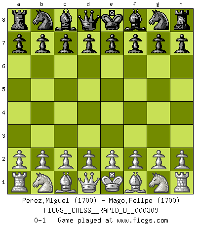 Last move : 0-1 2019 February 21 8:57:2 [Event "FICGS__CHESS__RAPID_B__000309"] [Site "FICGS"] [Date "2019.01.22"] [Round "1"] [White "Perez,Miguel"] [Black "Mago,Felipe"] [Result "0-1"] [WhiteElo "1700"] [BlackElo "1700"] 0-1 This chess game has been lost on time (started : 2019.01.22 0:16:36) Player Black won this chess game. Follow this game move after move (download)I am still a victim of Chess. It has all the beauty of art and much more. It cannot be commercialized. Chess is much purer than art in its social position. (Marcel Duchamp) Wenn ich mich einlogge, glauben die Leute gewöhnlich nicht, dass ich es selbst bin und sie fangen an, mir dumme Fragen zu stellen. Und wenn sie es glauben, stellen sie wieder andere dumme Fragen. (Judith Polgar) El juego de Fischer siempre fue nítido, racional y brillante. Uno de los mejores por siempre. (Dave Regis) Fischer est le meilleur joueur du monde et Karpov n'est qu'un joueur de bistrot. (Garry Kasparov, agé de 16 ans) There will be no order, only chaos. (Sol Robeson in Pi by Darren Aronofsky)