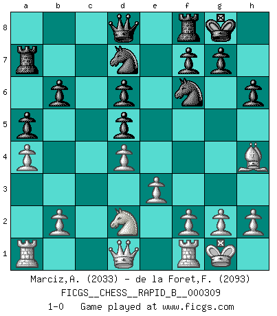 Last move : 1-0 2019 March 11 21:12:30 [Event "FICGS__CHESS__RAPID_B__000309"] [Site "FICGS"] [Date "2019.01.22"] [Round "1"] [White "Marciz,Alexander"] [Black "de la Foret,Fred"] [Result "1-0"] [WhiteElo "2033"] [BlackElo "2093"] 1.Nf3 Nf6 2.c4 e6 3.d4 b6 4.a3 Bb7 5.Nc3 d5 6.Bf4 Bd6 7.Bg5 Nbd7 8.cxd5 exd5 9.Nb5 h6 10.Nxd6+ cxd6 11.Bh4 O-O 12.e3 a5 13.Nd2 Ba6 14.Bxa6 Rxa6 15.a4 Ra7 16.O-O 1-0 Reti Opening Kingside Castling by player Black (move 11) Kingside Castling by player White (move 16) Player White won this chess game. Follow this game move after move (download)Those who say they understand Chess, understand nothing. (Robert Hubner) Ich bin stolz ein Bulgare zu sein. (Veselin Topalov) Todo se encuentra en un estado de flujo y esto incluye al mundo del Ajedrez. (Mikhail Botvinnik) On est toujours la mazette de quelqu'un d'autre. (Anonyme) Have no fear of perfection - you'll never reach it. (Salvador Dali)