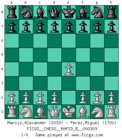 Last move : 1-0 2019 February 21 8:57:2 [Event "FICGS__CHESS__RAPID_B__000309"] [Site "FICGS"] [Date "2019.01.22"] [Round "1"] [White "Marciz,Alexander"] [Black "Perez,Miguel"] [Result "1-0"] [WhiteElo "2033"] [BlackElo "1700"] 1.e4 1-0 This chess game has been lost on time (started : 2019.01.22 0:16:36) King's pawn Opening Player White won this chess game. Follow this game move after move (download)When you play Bobby, it is not a question if you win or lose. It is a question if you survive. (Boris Spassky) Weshalb minderdergeübte Spieler mit g2-g4 beginnen? Die betreffenden sind unschlüssig, ob sie nun rechts (h4) oder links (f4) beginnen sollen, und in ihrer Ratlosigkeit entschliessen sie sich nach guter Bürgerart dazu, den goldenen Mittelweg zu wählen. (Aaron Nimzowitsch) Hay dos clases de hombres: aquellos que se conforman en dejarse llevar por las circunstancias y que juegan barajas y aquellos decididos a controlar las circunstancias y que juegan al Ajedrez. (Mortimer Collins) Il (Jacob Murray) ne joue pas pour le bon coup, mais pour le meilleur. (Eloi Relange) The intuitive mind is a sacred gift; the rational mind is a faithful servant. We have created a society that honors the servant but has forgotten the gift. (Albert Einstein)
