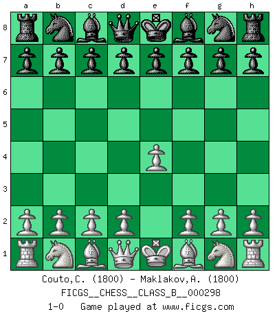 Last move : 1-0 2019 March 3 22:11:21 [Event "FICGS__CHESS__CLASS_B__000298"] [Site "FICGS"] [Date "2019.01.22"] [Round "1"] [White "Couto,Charles"] [Black "Maklakov,Alexander"] [Result "1-0"] [WhiteElo "1800"] [BlackElo "1800"] 1.e4 1-0 This chess game has been lost on time (started : 2019.01.22 1:38:9) King's pawn Opening Player White won this chess game. Follow this game move after move (download)Live, lose, and learn, by observing your opponent how to win. (Amber Steenbock) Schach ist mein Leben, meine Leidenschaft, was ich gelernt habe und seit meinem 14. Lebensjahr profimässig praktiziere. Darauf zu verzichten, würde mir sehr schwer fallen. (Viktor Kortschnoi) El Ajedrez es la vida. (Bobby Fischer) Il vaut mieux sacrifier les pièces de l'adversaire. (Xavier Tartacover) Do not put your faith in what statistics say until you have carefully considered what they do not say. (William W. Watt)