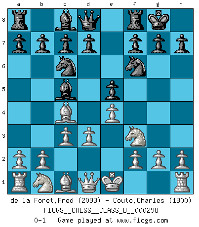 Last move : 0-1 2019 March 12 13:34:29 [Event "FICGS__CHESS__CLASS_B__000298"] [Site "FICGS"] [Date "2019.01.22"] [Round "1"] [White "de la Foret,Fred"] [Black "Couto,Charles"] [Result "0-1"] [WhiteElo "2093"] [BlackElo "1800"] 1.e4 e5 2.Nf3 Nc6 3.Bc4 Nf6 4.d3 Bc5 5.c3 O-O 0-1 Two knights defense (Modern Bishop's Opening) Kingside Castling by player Black (move 5) Player Black won this chess game. Follow this game move after move (download)The tactician must know what to do whenever something needs doing; the strategist must know what to do when nothing needs doing. (Savielly Tartakover) Sie führen leise Selbstgespräche, schlürfen lautstark ihre Getränke, schmatzen hörbar beim Essen, blasen ihrem Gegenüber Rauch in die Augen, niesen ihm ins Gesicht, starren ihn unverwandt an, bis er sich unter ihren Blicken windet, rutschen ständig auf ihrem Stuhl hin und her, rülpsen und bohren in der Nase. (Anonymous) El Jaque al descubierto es el bombardero del tablero. (Reuben Fine) Soyez une menace à chaque fois que vous vous asseyez pour jouer. (Ken Smith) Chess is everything: art, science and sport. (Anatoly Karpov)