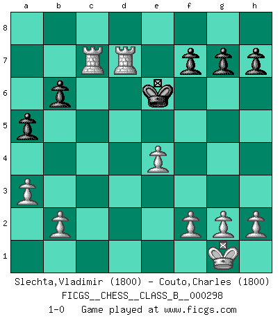 Last move : 1-0 2019 May 22 17:48:7 [Event "FICGS__CHESS__CLASS_B__000298"] [Site "FICGS"] [Date "2019.01.22"] [Round "1"] [White "Slechta,Vladimir"] [Black "Couto,Charles"] [Result "1-0"] [WhiteElo "1800"] [BlackElo "1800"] 1.d4 d5 2.c4 e6 3.Nc3 Nc6 4.e3 Bb4 5.Bd2 Nf6 6.Bd3 O-O 7.Nf3 Qe7 8.a3 Bxc3 9.Bxc3 e5 10.dxe5 Ng4 11.cxd5 Ncxe5 12.Bb4 Qe8 13.Bxf8 Kxf8 14.Be2 Bf5 15.Rc1 Rc8 16.Qb3 b6 17.Nxe5 Qxe5 18.Bxg4 Bxg4 19.Qb4+ Qe7 20.Qxg4 Rd8 21.O-O Qd7 22.Qxd7 Rxd7 23.e4 c5 24.dxc6 Ke8 25.cxd7+ Kxd7 26.Rfd1+ Ke6 27.Rc7 a5 28.R1d7 1-0 QGD : 3.Nc3 Kingside Castling by player Black (move 6) Kingside Castling by player White (move 21) Player White won this chess game. Follow this game move after move (download)All that matters on the Chessboard is good moves. (Bobby Fischer) Auf Remis zu spielen ist gewissermaßen ein Verbrechen gegen das Schachspiel. (Mikhail Nekhemyevich Tal) Un jugador que trata de regresar una movida en el Ajedrez es un futuro carterista. (Richard Fenton) Horreur, mais aussi harmonie suprême : qu'y avait-il en effet au monde en dehors des échecs ? Le brouillard, l'inconnu, le non-être... (Vladimir Nabokov) A good player is always lucky. (Capablanca)