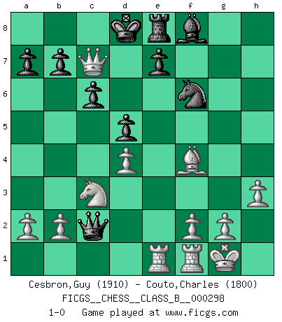 Last move : 1-0 2019 May 26 2:25:50 [Event "FICGS__CHESS__CLASS_B__000298"] [Site "FICGS"] [Date "2019.01.22"] [Round "1"] [White "Cesbron,Guy"] [Black "Couto,Charles"] [Result "1-0"] [WhiteElo "1910"] [BlackElo "1800"] 1.Nf3 Nc6 2.e4 f5 3.exf5 Nf6 4.d4 d5 5.Bd3 Qd6 6.O-O Nb4 7.Nc3 Nxd3 8.Qxd3 Bd7 9.Ne5 O-O-O 10.Nf7 Qc6 11.Nxh8 Re8 12.Nf7 g6 13.fxg6 hxg6 14.Ne5 Qd6 15.Qxg6 Qe6 16.Nxd7 Kxd7 17.Bf4 c6 18.h3 Kd8 19.Rae1 Qg8 20.Qf5 Qh7 21.Qe5 Qxc2 22.Qc7+ 1-0 Reti Opening Kingside Castling by player White (move 6) Queenside Castling by player Black (move 9) Player White won this chess game. Follow this game move after move (download)I'd rather have a Pawn than a finger. (Reuben Fine) Wenn Spassky eine Figur opfert kannst du genauso gut aufgeben. Aber wenn Tal eine Figur opfert, spiel weiter. Er könnte noch eine weitere opfern, und dann ... wer weiß? (Miguel Najdorf) Aquel que toma al Peón de Caballo de la Reina, se pasará la noche a dormir en la calle. (Anónimo) Tous ces prétendus hommes politiques sont les pions, les Cavaliers, les Tours ou les Fous d'une partie d'échecs qui se jouera tant qu'un hasard ne renversera pas l'échiquier. (Honoré de Balzac) Never was anything great achieved without danger. (Niccolo Machiavelli)