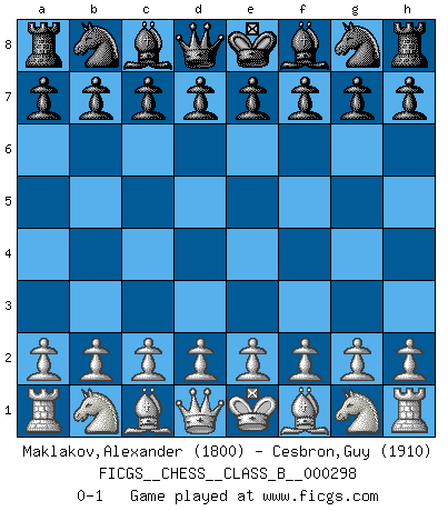 Last move : 0-1 2019 March 3 10:9:20 [Event "FICGS__CHESS__CLASS_B__000298"] [Site "FICGS"] [Date "2019.01.22"] [Round "1"] [White "Maklakov,Alexander"] [Black "Cesbron,Guy"] [Result "0-1"] [WhiteElo "1800"] [BlackElo "1910"] 0-1 This chess game has been lost on time (started : 2019.01.22 1:38:9) Player Black won this chess game. Follow this game move after move (download)Help your pieces so they can help you. (Paul Morphy) Fischer ist das größte Genie, das je vom Schachhimmel heruntergestiegen ist. (Mikhail Nekhemyevich Tal) Si un gobernante no entiende al Ajedrez, ¿como puede governar él un reinado?. (El Rey Khusros II) Les échecs c'est le défi de l'alpiniste, toujours plus haut, prêt à tout pour monter à l'assaut du Roi ennemi. Les échecs, c'est de la musique en mouvement, un ballet majestueux pour les yeux. C'est de la poésie composée par les fantômes du passé qui au même titre que Rimbaud ou Verlaine méritent notre admiration. Les échecs, c'est de la peinture ou le moindre mouvement modifie le tableau pour en faire un Picasso ou un Van Gogh. Les échecs, c'est tout et rien, c'est la vie et la mort. Jjulie33 sur le forum de France-Echecs. Treat your password like your toothbrush. Don't let anybody else use it, and get a new one every six months. (Clifford Stoll)