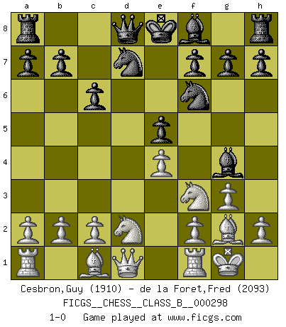 Last move : 1-0 2019 March 13 4:14:54 [Event "FICGS__CHESS__CLASS_B__000298"] [Site "FICGS"] [Date "2019.01.22"] [Round "1"] [White "Cesbron,Guy"] [Black "de la Foret,Fred"] [Result "1-0"] [WhiteElo "1910"] [BlackElo "2093"] 1.Nf3 Nf6 2.g3 d5 3.Bg2 c6 4.O-O Bg4 5.d3 Nbd7 6.Nbd2 e5 7.e4 dxe4 8.dxe4 1-0 Reti Opening Kingside Castling by player White (move 4) Player White won this chess game. Follow this game move after move (download)My God, Bobby Fischer plays so simply. (Alexei Suetin) Offensichtlich kennt Kasparow nichts anderes als Schach, und ich könnte 500 weitere Spieler dieser Sorte benennen. (Judith Polgar) Con o sin el título, Bobby Fischer fue sin lugar a dudas el mas grande jugador de su época. (Burt Hochberg) Les Echecs représentent une sphère d'idées créatrices basée sur la volonté des deux protagonistes. (Smyslov) The various flowers seem good to different people. (Chinese proverb)