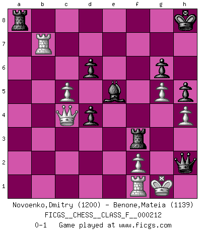 Last move : 0-1 2019 April 1 12:45:17 [Event "FICGS__CHESS__CLASS_F__000212"] [Site "FICGS"] [Date "2019.01.24"] [Round "1"] [White "Novoenko,Dmitry"] [Black "Benone,Mateia"] [Result "0-1"] [WhiteElo "1200"] [BlackElo "1139"] 1.Nf3 f5 2.g3 Nf6 3.Bg2 g6 4.O-O Bg7 5.d3 d6 6.Nbd2 e5 7.e4 Nc6 8.Re1 O-O 9.h3 f4 10.g4 h5 11.g5 Nd7 12.h4 a5 13.a3 Nc5 14.Nh2 a4 15.b3 axb3 16.cxb3 Nxd3 17.Rf1 Nd4 18.Ndf3 Nxc1 19.Nxd4 exd4 20.Qxc1 Be6 21.Rb1 Qd7 22.Qd1 Rxa3 23.Nf3 Bg4 24.Qd3 c5 25.Nh2 Be6 26.e5 Bf5 27.Be4 Bxe5 28.Qc4+ Kh7 29.Bxf5 Qxf5 30.Qc1 Rfa8 31.b4 f3 32.bxc5 Qh3 33.Rxb7+ Kh8 34.Nxf3 Rxf3 35.Qc4 Qh2+ 0-1 Reti v Dutch Kingside Castling by player White (move 4) Kingside Castling by player Black (move 8) Player Black won this chess game. Follow this game move after move (download)If Chess is a science, it's a most inexact one. If Chess is an art, it is too exacting to be seen as one. If Chess is a sport, it's too esoteric. If Chess is a game, it's too demanding to be just a game. If Chess is a mistress, she's a demanding one. If Chess is a passion, it's a rewarding one. If Chess is life, it's a sad one. (Unknown) Der Freibauer hat für mich eine Seele, genau wie der Mensch, Wünsche, die unerkannt in ihm schlummern, und Befürchtungen, von deren Existenz er selbst kaum ahnt. (Aaron Nimzowitsch) El Ajedrez es parte de la cultura, y si una cultura esta en decadencia, entonces también el Ajedrez declinará. (Mikhail Botvinnik) Une platitude souvent récitée à propos des Echecs est qu'une des choses les plus difficiles à réaliser est de gagner une position gagnante. Cela ne manque pas de sens mais, pour ma part, j'ai toujours trouvé plus difficile de gagner une position perdante. (Tim Krabbe) Luck is what you have left over after you give 100 percent. (Langston Coleman)