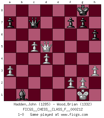 Last move : 1-0 2019 May 5 8:56:52 [Event "FICGS__CHESS__CLASS_F__000212"] [Site "FICGS"] [Date "2019.01.24"] [Round "1"] [White "Hadden,John"] [Black "Wood,Brian"] [Result "1-0"] [WhiteElo "1285"] [BlackElo "1332"] 1.d4 e6 2.Nc3 d5 3.Nf3 Nf6 4.Bg5 c6 5.e3 Nbd7 6.Ne5 Be7 7.Bd3 Nxe5 8.h3 Nxd3+ 9.cxd3 O-O 10.O-O h6 11.Bxf6 Bxf6 12.a3 e5 13.dxe5 Bxe5 14.d4 Bf6 15.Qe2 b6 16.b4 Re8 17.Qd2 Bf5 18.Rae1 c5 19.dxc5 bxc5 20.bxc5 Bxc3 21.Qxc3 Qc7 22.Rd1 Rad8 23.Rd4 Re4 24.Rfd1 Rxd4 25.exd4 Rb8 26.Qf3 Rb1 27.Rxb1 Bxb1 28.Qxd5 1-0 Queen's pawn Kingside Castling by player Black (move 9) Kingside Castling by player White (move 10) Player White won this chess game. Follow this game move after move (download)Chess is the art of analysis. (Mikhail Botvinnik) Kein Schachspieler kann gut schlafen. (H. G. Wells) Los Peones son nacidos libres, y aún así, se encuentran por doquier encadenados. (Rick Kennedy) La tactique, c'est ce que vous faites quand il y a quelque chose à faire; la stratégie, c'est ce que vous faites quand il n'y a rien à faire. (Savielli Tartacower) Life is painting a picture, not doing a sum. (Oliver Wendell Holmes, Jr.)