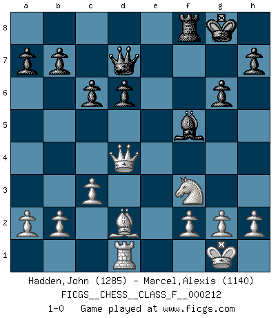 Last move : 1-0 2019 May 20 9:18:11 [Event "FICGS__CHESS__CLASS_F__000212"] [Site "FICGS"] [Date "2019.01.24"] [Round "1"] [White "Hadden,John"] [Black "Marcel,Alexis"] [Result "1-0"] [WhiteElo "1285"] [BlackElo "1140"] 1.d4 f5 2.Nc3 Nf6 3.e3 g6 4.Nf3 Bg7 5.Bd3 O-O 6.Bd2 d6 7.Qe2 Re8 8.O-O Nbd7 9.e4 fxe4 10.Bxe4 Nxe4 11.Nxe4 Nf6 12.c3 Nxe4 13.Qxe4 c6 14.Rae1 Bf5 15.Qe3 e5 16.dxe5 Bxe5 17.Qh6 Bg7 18.Qg5 Bf6 19.Rxe8+ Qxe8 20.Qxf6 Qd7 21.Rd1 Rf8 22.Qd4 1-0 Dutch Kingside Castling by player Black (move 5) Kingside Castling by player White (move 8) Player White won this chess game. Follow this game move after move (download)It is no time to be playing Chess when the house is on fire. (Italian Proverb) Charakterschwächen offenbaren sich normalerweise während einer Schachpartie. (Garry Kasparov) El Ajedrez es un cuento de Hadas de las 1001 metidas de pata. (Savielly Tartakower) Ce qui caractérise les parties de combat, c'est que si le défenseur a constamment de difficiles problèmes à résoudre, l'attaquant doit chercher sans relâche de nouvelles possibilités d'attaque. (Koblentz) Employ the attack like tactic of defense. (Chinese proverb)