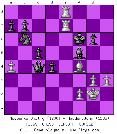 Last move : 0-1 2019 August 18 7:59:57 [Event "FICGS__CHESS__CLASS_F__000212"] [Site "FICGS"] [Date "2019.01.24"] [Round "1"] [White "Novoenko,Dmitry"] [Black "Hadden,John"] [Result "0-1"] [WhiteElo "1200"] [BlackElo "1285"] 1.Nf3 d5 2.g3 Nf6 3.Bg2 Nc6 4.O-O e5 5.d3 Be6 6.Nbd2 Bd6 7.e4 dxe4 8.dxe4 O-O 9.c4 Nd4 10.Nxd4 exd4 11.Re1 Be5 12.Nf3 Qd6 13.Nxe5 Qxe5 14.Bf4 Qc5 15.b3 Qb6 16.e5 Nd7 17.Qc2 Rfe8 18.a4 h6 19.Rad1 Bg4 20.Rd2 c5 21.Qe4 Qxb3 22.Bxh6 Nxe5 23.Bf4 Nxc4 24.Qxe8+ Rxe8 25.Rxe8+ Kh7 26.Be4+ g6 27.Bc2 Qc3 28.Bxg6+ fxg6 29.Re7+ Kg8 30.Ra2 Qb4 31.Kg2 Nb6 32.h3 Bf5 33.Rae2 Qc4 34.Re8+ Kf7 35.R2e7+ Kf6 0-1 This chess game has been lost on time (started : 2019.01.24 19:43:48) Reti : King's Indian attack (Barcza system) Kingside Castling by player White (move 4) Kingside Castling by player Black (move 8) Player Black won this chess game. Follow this game move after move (download)Chess is above all, a fight ! (Emanuel Lasker) Obwohl ich alt bin, darf mir niemand den Finger in den Mund stecken, sonst beisse ich. (Wilhelm Steinitz) El estómago es una parte esencial del maestro de Ajedrez. (Bent Larsen) Les Cavaliers se révèlent fort utiles dans les positions fermées. D'habitude, les Fous sont un peu plus forts que les Cavaliers dans les positions ouvertes. Qu'on le veuille ou non, il restera toujours des exceptions ! Real knowledge is to know the extent of one's ignorance. (Confucius)