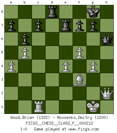 Last move : 1-0 2019 June 30 18:48:18 [Event "FICGS__CHESS__CLASS_F__000212"] [Site "FICGS"] [Date "2019.01.24"] [Round "1"] [White "Wood,Brian"] [Black "Novoenko,Dmitry"] [Result "1-0"] [WhiteElo "1332"] [BlackElo "1200"] 1.d4 d5 2.c4 e6 3.g3 Nf6 4.Bg2 Be7 5.Nc3 O-O 6.Nf3 dxc4 7.O-O Nc6 8.Bf4 Nd5 9.Nxd5 exd5 10.a3 Bf5 11.b4 Qc8 12.Ne5 Nxe5 13.Bxe5 Bh3 14.Bxd5 Bxf1 15.Qxf1 Bd6 16.Bxc4 Bxe5 17.dxe5 Qg4 18.Bd3 Rad8 19.f4 Rfe8 20.b5 h5 21.a4 h4 22.Qf2 hxg3 23.hxg3 Re6 24.Be4 b6 25.Bf3 Qf5 26.e4 Qh7 27.f5 Rxe5 28.Rc1 Re7 29.g4 Qh6 30.Qh2 1-0 This chess game has been lost on time (started : 2019.01.24 19:43:48) Queen's gambit declined Kingside Castling by player Black (move 5) Kingside Castling by player White (move 7) Player White won this chess game. Follow this game move after move (download)There are two types of sacrifices: correct ones and mine. (Mikhail Tal) Wenn ich gewinne bin ich ein Genie. Wenn nicht, dann bin ich keines. (Robert James Fischer) Siempre es mejor sacrificar los hombres de tu oponente. (Savielly Tartakower) On croit qu'il y a plus de mauvais joueurs que de bons joueurs, c'est faux : Il y a autant de joueurs qui gagnent que de joueurs qui perdent. (Philippe Geluck) Better than a thousand days of diligent study is one day with a great teacher. (Japanese proverb)