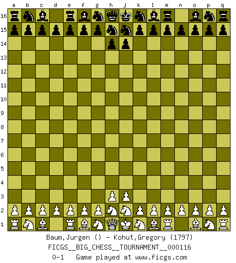 Last move : 0-1 2019 February 25 9:18:34 [Event "FICGS__BIG_CHESS__TOURNAMENT__000116"] [Site "FICGS"] [Date "2019.01.26"] [Round "1"] [White "Baum,Jurgen"] [Black "Kohut,Gregory"] [Result "0-1"] [WhiteElo ""] [BlackElo "1797"] 0-1 This big chess game has been lost on time (started : 2019.01.26 8:18:14) Follow this game move after move (download)The combination player thinks forward; he starts from the given position, and tries the forceful moves in his mind. (Emanuel Lasker) Es gibt keine einzige Frau, der ich nicht einen Springer vorgeben könnte und trotzdem gewänne. (Robert James Fischer) Nos gusta pensar. (Gary Kasparov) Les échecs sont utiles à l'exercice de la faculté de penser et à celle de l'imagination. Car nous devons posséder une méthode élaborée pour atteindre des buts partout où nous devons conduire notre raison. (Leibnitz) Luck never gives; it only lends. (Swedish proverb)