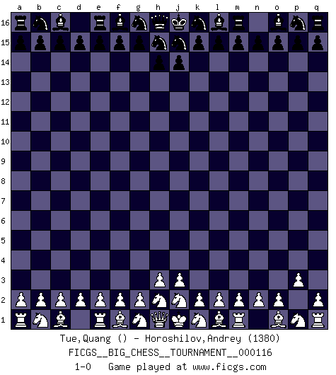Last move : 1-0 2019 January 26 11:14:7 [Event "FICGS__BIG_CHESS__TOURNAMENT__000116"] [Site "FICGS"] [Date "2019.01.26"] [Round "1"] [White "Tue,Quang"] [Black "Horoshilov,Andrey"] [Result "1-0"] [WhiteElo ""] [BlackElo "1380"] 1.p2-p3 1-0 Follow this game move after move (download)First-class players lose to second class players because second-class players sometimes play a first-class game. (Tarrasch) Je mehr wir mit Computern analysieren, desto mehr glauben wir an Verteidigung. (Vladimir Kramnik) Bobby Fischer es el mas grande genio de Ajedrez de todos los tiempos. (Alexander Kotov) C'est la seule position que je connaisse où les deux camps sont mals. Propos prêtés à V. Anand. A clear conscience is usually the sign of a bad memory. (Unknown)
