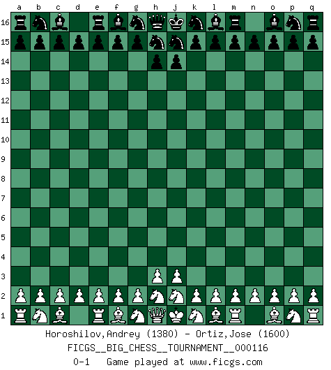 Last move : 0-1 2019 January 26 8:55:2 [Event "FICGS__BIG_CHESS__TOURNAMENT__000116"] [Site "FICGS"] [Date "2019.01.26"] [Round "1"] [White "Horoshilov,Andrey"] [Black "Ortiz,Jose"] [Result "0-1"] [WhiteElo "1380"] [BlackElo "1600"] 0-1 Follow this game move after move (download)Chess demands total concentration. (Bobby Fischer) Computer sind die einzigen Gegner, die nicht immer eine Ausrede auf Lager haben, wenn sie gegen mich verlieren. (Robert James Fischer) No todos los artistas son jugadores de Ajedrez, pero todos los jugadores de Ajedrez son artistas. (Marcel Duchamp) Les échecs, c'est la lutte contre l'erreur. (Johannes Zukertort) It is not enough to be a good player... you must also play well. (Siegbert Tarrasch)