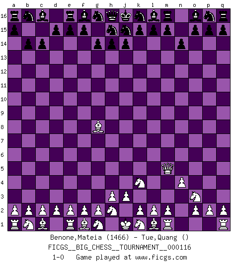 Last move : 1-0 2019 March 2 22:6:4 [Event "FICGS__BIG_CHESS__TOURNAMENT__000116"] [Site "FICGS"] [Date "2019.01.26"] [Round "1"] [White "Benone,Mateia"] [Black "Tue,Quang"] [Result "1-0"] [WhiteElo "1466"] [BlackElo ""] 1.j2-k4 b15-b14 2.h1-m5 c15-c14 3.n2-n4 g15-g14 4.o1-g8 n15-n14 5.p1-o3 1-0 This big chess game has been lost on time (started : 2019.01.26 8:18:14) Follow this game move after move (download)The boy (then a 12 year old boy named Anatoly Karpov) doesn't have a clue about Chess, and there's no future at all for him in this profession. (Mikhail Botvinnik) Jeder Fehler erscheint unglaublich dumm, wenn andre ihn begehen. (Georg Christoph Lichtenberg) El Ajedrez es tan inspirador que yo no creo que un buen jugador sea capaz de tener un pensamiento malo durante una partida. (Wilhelm Steinitz) Même un GMI sait rarement calculer sur plus de cinq coups une attaque à sacrifices. (Rudolf Spielmann) A journey of a thousand sites begins with a single click. (Author unknown)