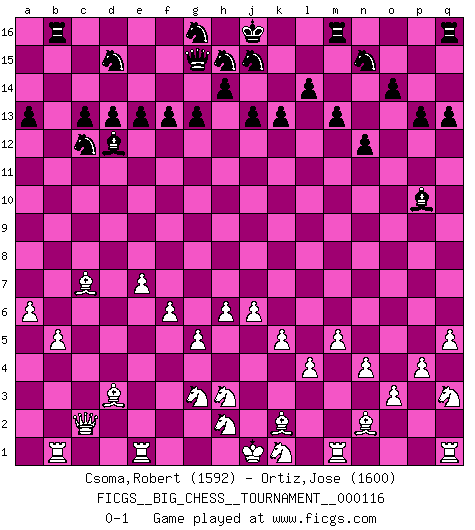 Last move : 0-1 2019 July 4 1:45:28 [Event "FICGS__BIG_CHESS__TOURNAMENT__000116"] [Site "FICGS"] [Date "2019.01.26"] [Round "1"] [White "Csoma,Robert"] [Black "Ortiz,Jose"] [Result "0-1"] [WhiteElo "1592"] [BlackElo "1600"] 1.c2-c3 n15-n13 2.f2-f3 e15-e13 3.l2-l3 d15-d13 4.o2-o3 m15-m13 5.a2-a4 l15-l14 6.b2-b4 o16-m14 7.d2-d4 k15-k13 8.e2-e4 l16-o13 9.g2-g4 g15-g13 10.k2-k4 f16-k12 11.m2-m4 o15-o14 12.n2-n4 c15-c13 13.p2-p4 c16-k9 14.q2-q4 b16-d15 15.c1-d2 p16-n15 16.f3-f4 h15-f14 17.h3-h4 b15-b13 18.o1-b13 a16-b16 19.b13-n2 k9-g6 20.h4-h5 g6-f7 21.j3-j4 f7-h9 22.j2-g3 b16-b6 23.l1-k2 k12-b4 24.c3-b4 p15-p13 25.a4-a5 b6-c6 26.b4-b5 c6-c8 27.d4-d5 q15-q13 28.a5-a6 d15-b14 29.e4-e5 a15-a13 30.d5-d6 o13-b1 31.a1-b1 h9-j8 32.f4-f5 c8-c2 33.d2-a5 j14-j13 34.j4-j5 j8-l10 35.m4-m5 l10-o7 36.h1-e4 m14-d6 37.e4-c2 d6-g9 38.e5-e6 g9-d12 39.f5-f6 f14-d15 40.e6-e7 k16-h15 41.g1-h3 o7-n8 42.h5-h6 e16-b16 43.q4-q5 f15-f13 44.l3-l4 h16-g15 45.g4-g5 d12-a9 46.a5-c7 a9-d12 47.k4-k5 n8-o9 48.j5-j6 n13-n12 49.p1-q3 b14-c12 50.f1-d3 o9-p10 0-1 This big chess game has been lost on time (started : 2019.01.26 8:18:14) Follow this game move after move (download)Chess is everything: art, science and sport. (Anatoly Karpov) Darum geht es im Schach. Einen Tag gibst du deinem Gegner eine Lektion, am nächsten Tag gibt er dir eine. (Robert James Fischer) Cuando no sepas que mover, espera por una idea que se le venga a la la cabeza de tu oponente. Tenlo por seguro de que esa idea estará incorrecta. (Siegbert Tarrasch) J'ai vu le vaincu d'Echecs jouer des années durant dans l'espoir de la fête de la victoire. Car tu es plus riche de ce qu'elle existe si même elle n'est point pour toi. Ainsi de la perle du fond des mers. (Antoine de Saint-Exupéry) The absolute truth is the thing that makes people laugh. (Carl Reiner)