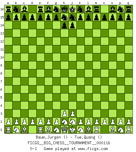 Last move : 0-1 2019 February 25 9:18:34 [Event "FICGS__BIG_CHESS__TOURNAMENT__000116"] [Site "FICGS"] [Date "2019.01.26"] [Round "1"] [White "Baum,Jurgen"] [Black "Tue,Quang"] [Result "0-1"] [WhiteElo ""] [BlackElo ""] 0-1 This big chess game has been lost on time (started : 2019.01.26 8:18:14) Follow this game move after move (download)One of these modest little moves may be more embarrassing to your opponent than the biggest threat. (Siegbert Tarrasch) Alle offensichtlichen Züge sehen nach dem Spiel in der Analyse verdächtig aus. (Viktor Kortschnoi) Nos gusta pensar. (Gary Kasparov) A ce moment-là, je menaçais de comprendre la position ! (Clément L'Heureux) Watch your thoughts; they become words. Watch your words; they become actions. Watch your actions; they become habits. Watch your habits; they become character. Watch your character; it becomes your destiny. (Frank Outlaw)