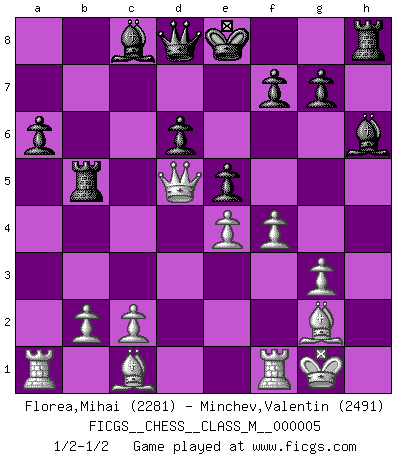 Last move : 1/2-1/2 2006 August 7 23:4:6 [Event "FICGS__CHESS__CLASS_M__000005"] [Site "FICGS"] [Date "2006.06.13"] [Round "1"] [White "Florea,Mihai"] [Black "Minchev,Valentin"] [Result "1/2-1/2"] [WhiteElo "2281"] [BlackElo "2491"] 1.e4 c5 2.Nf3 Nc6 3.d4 cxd4 4.Nxd4 e5 5.Nb5 d6 6.N1c3 a6 7.Na3 Be7 8.Nc4 b5 9.Ne3 Nf6 10.g3 h5 11.Bg2 h4 12.O-O Rb8 13.Ncd5 Nxd5 14.Nxd5 Bg5 15.f4 Bh6 16.a4 Ne7 17.axb5 Nxd5 18.Qxd5 hxg3 19.hxg3 Rxb5 1/2-1/2 Sicilian : Labourdonnais-Loewenthal (Kalashnikov) variation Kingside Castling by player White (move 12) This chess game ended in a draw. Follow this game move after move (download)Strategy requires thought, tactics require observation. (Max Euwe) Über die Verhaftung Bobby Fischers: Warum es die Bush-Administration für nötig befindet einen 61 Jahre alten Mann zu hetzten, der für niemanden ausser sich selbste eine Gefahr darstellt ist ein Rätsel. (Nigel Short) En la vida, como en el Ajedrez, los Peones propios obstruyen nuestro camino. La gran fortuna de un hombre, su comodidad, placer, hijos, libros, que deberían ayudarle a ganar, con mucha frecuencia lo ponen en Jaque Mate. (Charles Buxton) Dieu déplace le joueur, et celui-ci la pièce. Quel Dieu derrière Dieu commence donc la trame ? Arturo Perez-Reverte (prix de littérature policière 1993). Kids, you tried your best and you failed miserably. The lesson is, never try. (Simpsons)