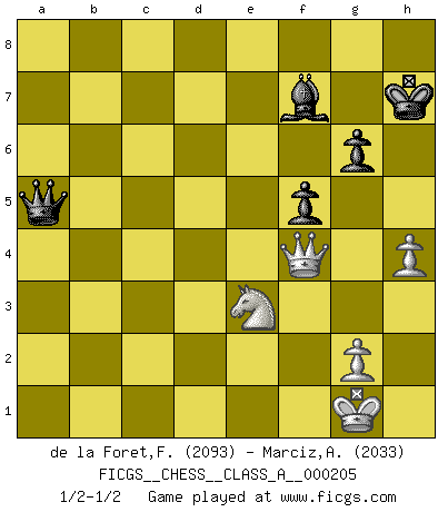 Last move : 1/2-1/2 2019 April 17 4:57:36 [Event "FICGS__CHESS__CLASS_A__000205"] [Site "FICGS"] [Date "2019.01.26"] [Round "1"] [White "de la Foret,Fred"] [Black "Marciz,Alexander"] [Result "1/2-1/2"] [WhiteElo "2093"] [BlackElo "2033"] 1.d4 Nf6 2.c4 g6 3.Nc3 d5 4.cxd5 Nxd5 5.e4 Nxc3 6.bxc3 Bg7 7.Bc4 c5 8.Ne2 Nc6 9.Be3 O-O 10.O-O Na5 11.Bb5 a6 12.Bd3 b5 13.dxc5 Be6 14.Bd4 Nc6 15.Bxg7 Kxg7 16.f4 Qc7 17.Qc1 Rac8 18.Nd4 Bd7 19.a4 Nb8 20.axb5 axb5 21.Qe3 Qxc5 22.Rac1 e6 23.Kh1 b4 24.f5 exf5 25.exf5 bxc3 26.Rf3 f6 27.fxg6 hxg6 28.Qf2 Qg5 29.Re1 f5 30.Rfe3 Nc6 31.Bb5 c2 32.Nxc2 Rfe8 33.Rd1 Rxe3 34.Nxe3 Be6 35.Rd6 Nd8 36.Nf1 Qf6 37.Qb6 Qb2 38.Kg1 Bf7 39.h4 Qb4 40.Rxd8 Rxd8 41.Qxd8 Qxb5 42.Qd4+ Kh7 43.Ne3 Qa5 44.Qf4 1/2-1/2 King's Indian defense, 3.Nc3 Kingside Castling by player Black (move 9) Kingside Castling by player White (move 10) 10 pieces endgame at move 41 : White KQNPP , Black KQBPP WHITE : King + 1 Queen 1 Knight 2 Pawns BLACK : King + 1 Queen 1 Bishop 2 Pawns This chess game ended in a draw. Follow this game move after move (download)I like to say that Bobby Fischer was the greatest player ever. But what made Fischer a genius was his ability to blend an American freshness and pragmatism with Russian ideas about strategy. (Bruce Pandolfini) Kasparov ist eine Art Monster mit hundert Augen, denen auch nicht das Geringste entgeht. (Tony Miles) El poder defensivo de una pieza clavada, solamente es imaginario. (Aaron Nimzovich) Des idées, des idées, j'en ai cent, j'en ai mille. Des bonnes, des mauvaises, applicables, irréalisables... Il suffit de faire le tri ! (Roos) Life is pain my dear and anyone who says otherwise is selling something. (Princess Bride)
