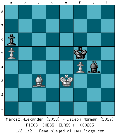 Last move : 1/2-1/2 2019 February 23 18:40:57 [Event "FICGS__CHESS__CLASS_A__000205"] [Site "FICGS"] [Date "2019.01.26"] [Round "1"] [White "Marciz,Alexander"] [Black "Wilson,Norman"] [Result "1/2-1/2"] [WhiteElo "2033"] [BlackElo "2057"] 1.e4 e6 2.d4 d5 3.Nc3 Bb4 4.e5 c5 5.a3 Bxc3+ 6.bxc3 Ne7 7.Qg4 O-O 8.Bd3 f5 9.exf6 Rxf6 10.Bg5 Rf7 11.Qh5 g6 12.Qd1 Qa5 13.Nf3 Nbc6 14.Bd2 c4 15.Be2 Nf5 16.h4 h6 17.a4 Bd7 18.Rb1 b6 19.O-O Kh7 20.Ra1 Re8 21.Re1 e5 22.dxe5 Rfe7 23.Nh2 Nxe5 24.Ng4 Nxg4 25.Bxg4 Rxe1+ 26.Bxe1 Qc5 27.Bd2 Qd6 28.Qf3 Re4 29.h5 Kg7 30.Qh3 d4 31.a5 b5 32.hxg6 Qxg6 33.Bxf5 Bxf5 34.Qh2 d3 35.cxd3 cxd3 36.c4 Qf6 37.Rc1 Rxc4 38.Qg3+ Kh7 39.Rxc4 bxc4 40.Qc7+ Kg6 41.Qxc4 Qa1+ 42.Kh2 Qe5+ 43.Bf4 Qe6 44.Qd4 Qf6 45.Qxf6+ Kxf6 46.Bxh6 Bg4 47.f3 Bd7 48.Kg3 Ba4 49.Bd2 a6 50.Kg4 Bd1 51.Kh5 Be2 52.Bc1 Bd1 53.Bg5+ Kg7 54.Kh4 Kg6 55.Bd2 Bc2 56.g4 Bb3 57.f4 Be6 58.Bc3 Bc8 59.Kg3 Bd7 60.Kf3 Be6 61.Ke4 Bxg4 62.Kxd3 Kf5 63.Ke3 1/2-1/2 French : Winawer, Advance, poisoned pawn variation Kingside Castling by player Black (move 7) Kingside Castling by player White (move 19) 10 pieces endgame at move 45 : White KBPPP , Black KBPPP WHITE : King + 1 Bishop 3 Pawns BLACK : King + 1 Bishop 3 Pawns 9 pieces endgame at move 46 : White KBPPP , Black KBPP WHITE : King + 1 Bishop 3 Pawns BLACK : King + 1 Bishop 2 Pawns 8 pieces endgame at move 61 : White KBPP , Black KBPP WHITE : King + 1 Bishop 2 Pawns BLACK : King + 1 Bishop 2 Pawns 7 pieces endgame at move 62 : White KBPP , Black KBP WHITE : King + 1 Bishop 2 Pawns BLACK : King + 1 Bishop 1 Pawn This chess game ended in a draw. Follow this game move after move (download)He who takes the Queen's Knight's Pawn will sleep in the streets. (Anonymous) Im Fernschach kannst du während dem Spiel rauchen. (John Christen Knudsen) Es muy difícil jugar en contra de la teoría de Einstein. - en su primera derrota en contra de Fischer (Mikhail Tal) Mais l'homme est une créature légère et illogique : semblable au joueur d'échecs, il n'aime que le processus du but à atteindre, non le but lui-même. (Dostoïevsky) Any activity becomes creative when the doer cares about doing it right or doing it better. (John Updike)